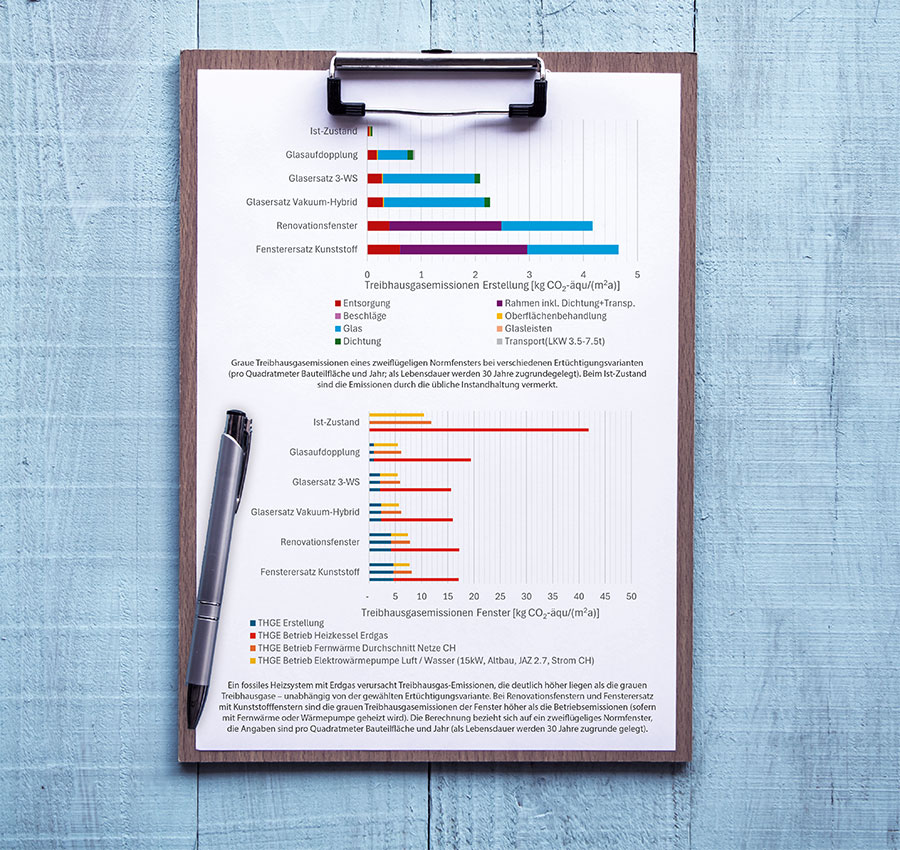 Die Forscherinnen und Forscher von FHNW und Zirkular GmbH konnten zeigen, dass die Ertüchtigung eines Fensters deutlich weniger graue Treibhausgas-Emissionen verursacht als der Einbau eines neuen Fensters (vergleiche Grafik 02). Besonders klimafreundlich sind die Ertüchtigungsvarianten Glasaufdopplung, Glasersatz und Glasersatz Vakuum-Hybrid. So verursacht beispielsweise eine Glasauf-dopplung 80 Prozent weniger Emissionen als der Ersatz durch Fenster mit Kunststoffrahmen. Bisher steht bei einem Fensterersatz in der Regel die Verminderung der Betriebsenergie im Fokus. Bei einer ganzheitlichen Betrachtung der Emissionen aus Herstellung und Betrieb werden die Ertüchtigungsvarianten auch interessant und sollten mitberücksichtigt werden. Dies gilt insbesondere für Ge-bäude, die erneuerbar beheizt werden. Die Bedeutung des Heizsystems betont auch der FenSanReuse-Schlussbericht: «Es zeigt sich, dass die Kombination aus Fensterertüchtigung und erneuerbarem Heizsystem oft zu besseren Gesamtergebnissen führt als ein Fensterersatz bei fossiler Wärmeerzeugung.»