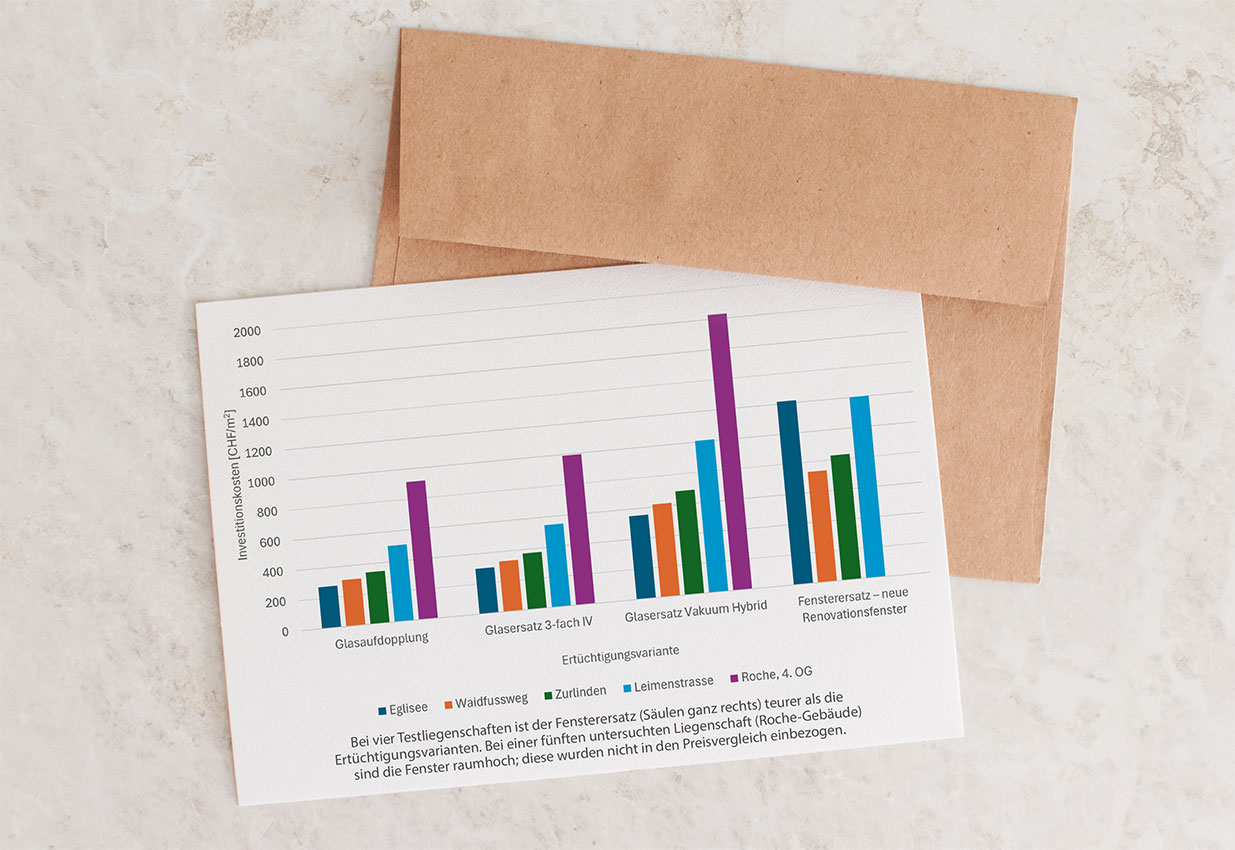 In ihren Sanierungsempfehlungen kamen die Wissenschaftlerinnen und Wissenschaftler zum Schluss, dass in vier der fünf untersuchten Gebäude die Fenster (Rahmen und Verglasung) trotz ihres Alters von 20 bis 30 Jahren erhalten werden können und eine einfache Ertüchtigung ausreicht (vergleiche Grafik 04). Gemeint ist damit zum Beispiel das Einstellen / Reparieren der Beschläge oder die Ergänzung der Dichtung. Barbara Sintzel: «Wir finden es schade, wenn man noch gute Qualität hat und solche Fenster blind ersetzt.» Für die Aufarbeitung der alten Fenster anstelle des Einbaus neuer sprechen im Übrigen auch die Kosten. Diese betragen in vielen Fällen nur rund die Hälfte (vergleiche Grafik 05).