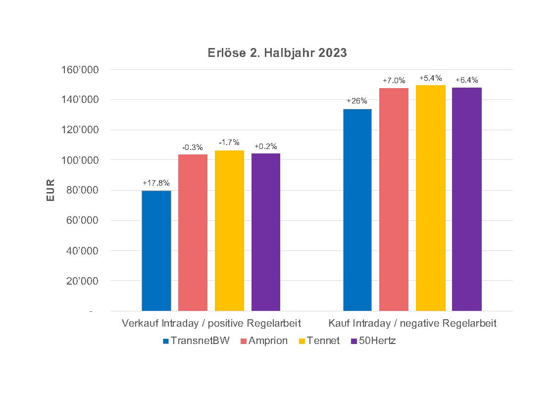 Die untere Grafik (Grafik 01b) zeigt, wie viel der Anbieter verdient, wenn er seine flexible Kapazität auf dem Markt (Intraday-Markt oder Regelenergie-Markt) anbietet, nämlich dort, wo er aktuell den besseren Preis erhält. Man erkennt: Die Erträge für die Regelzone TransnetBW sind jetzt fast gleich hoch wie in den anderen Zonen. Ausgedrückt in Zahlen: Der Flexibilitätsanbieter löst rund 80’000 EUR, wenn er seine flexible Kapazität nicht nur im zeitstetigen Intraday-Handel innerhalb der Regelzone TransnetBW, sondern auch auf dem Regelenergie-Markt anbietet, abhängig davon, wo er gerade den besseren Preis erwartet. Das sind rund 12’000 EUR mehr, als wenn er die flexible Kapazität allein für den Intraday-Handel innerhalb der Regelzone TransnetBW anbietet.