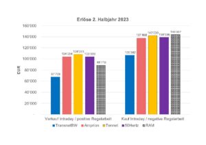 Die obere Grafik (Grafik 01a) zeigt, wie viel der Anbieter verdient, wenn er seine flexible Kapazität entweder in einer der vier deutschen Regelzonen (TransnetBW, Amprion, Tennet, 50Hertz) am Intraday-Markt anbietet, oder aber zur Gänze auf dem deutschen Regelenergie-Markt (offizielle Bezeichnung: Regelarbeitsmarkt/RAM). Die Säulengruppe links zeigt die potenziellen Erträge aus der flexibel abrufbaren Lieferung von Strom, die Säulengruppe rechts die Erträge aus dem flexibel abrufbaren Bezug von Strom. Die Erträge fallen in der Regelzone von TransnetBW relativ gering aus, weil es sich um einen kleinen Markt mit wenig Anbietern handelt. Die Folge davon sind eine geringere Liquidität und höhere Transaktionskosten.